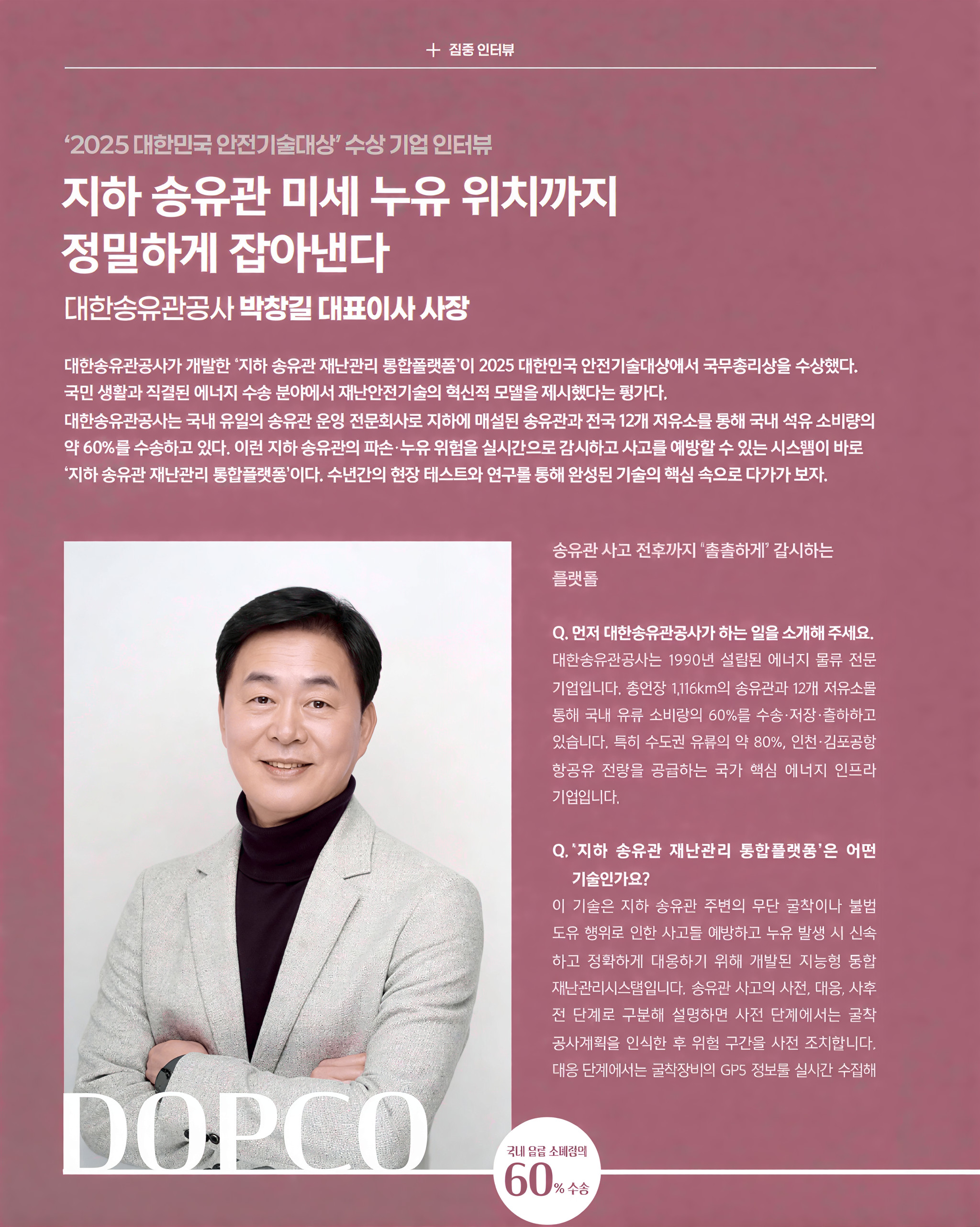 대한송유관공사(박창길 대표이사 사장)2025년 대한민국 안전기술대상 국무총리상 수상 인터뷰를 진행했다